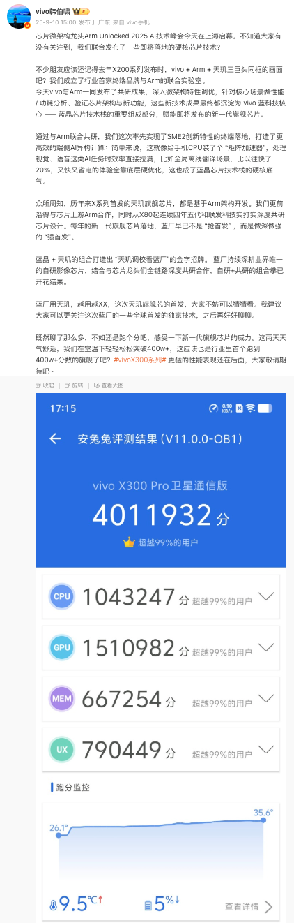 如上图所见,vivo产品经理韩伯啸晒出了vivo X300 Pro卫星通信版的跑分,表示