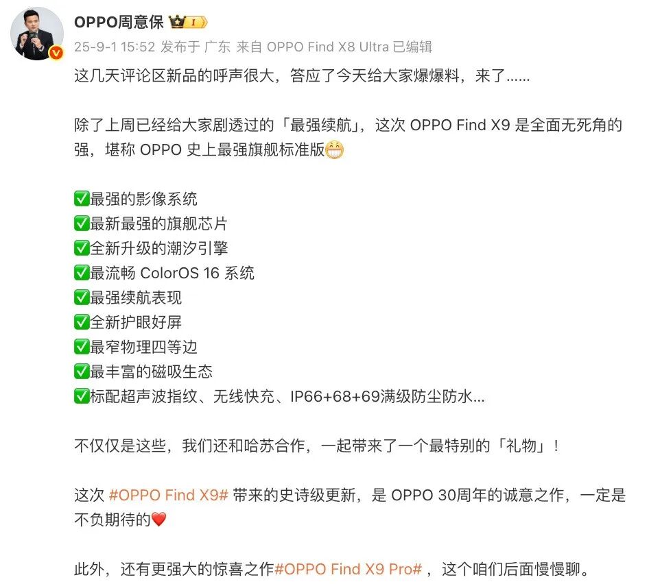 如上图所见,OPPO Find系列产品负责人周意保晒出了Find X9真机正面照,表示上一代OPPO Find X8s已经超越了iPhone16 Pro Max,做到了当时的行业黑边最窄1.25mm。这一代Find X9再次突破,做到了比Find X8s更窄,很可能是行业最窄的物理四等边,并表示Find X9 Pro也是同样窄边框。