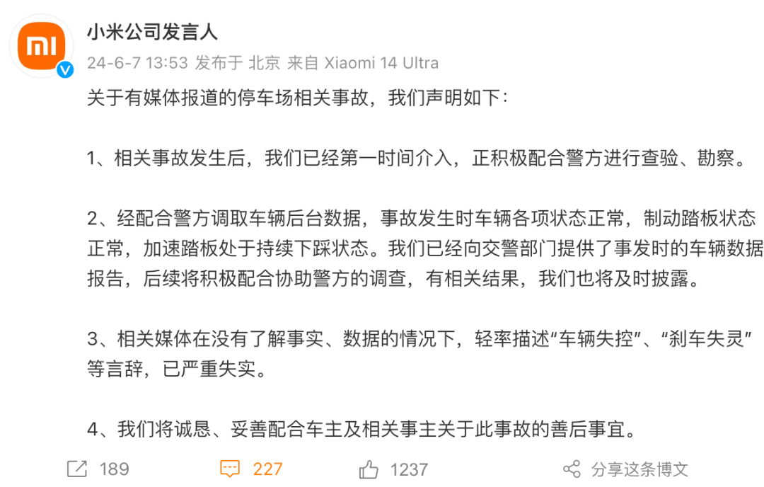 6月7日13:53,小米公司发言人发布声明:「关于有媒体报道的停车场相关事故,声明如下:1、相关事故发生后,已经第一时间介入,正积极配合警方进行查验、勘察。2、经配合警方调取车辆后台数据,事故发生时车辆各项状态正常,制动踏板状态正常,加速踏板处于持续下踩状态。已经向交警部门提供了事发时的车辆数据报告,后续将积极配合协助警方的调查,有相关结果,也将及时披露。3、相关媒体在没有了解事实、数据的情况下,轻率描述“车辆失控”、“刹车失灵”等言辞,已严重失实。4、将诚恳、妥善配合车主及相关事主关于此事故的善后事宜。」
