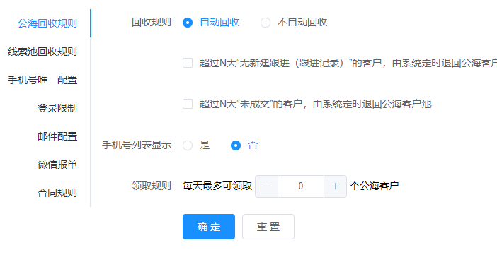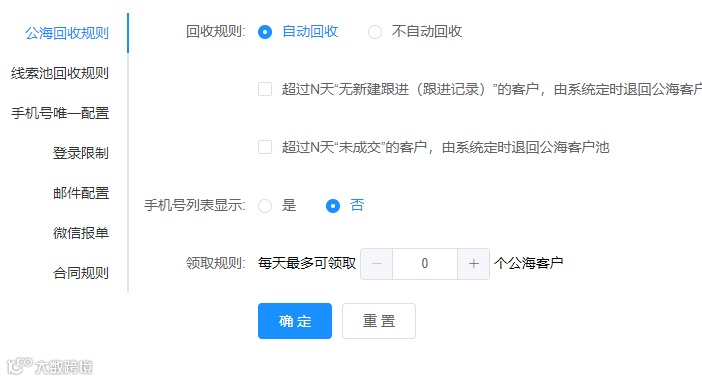 公海可以很好的解决,流动的问题,当然也会导致销售作弊,避免有的销售长期占用优质资源不成单。还可以设置销售领取数量,避免吃多了嚼不烂。