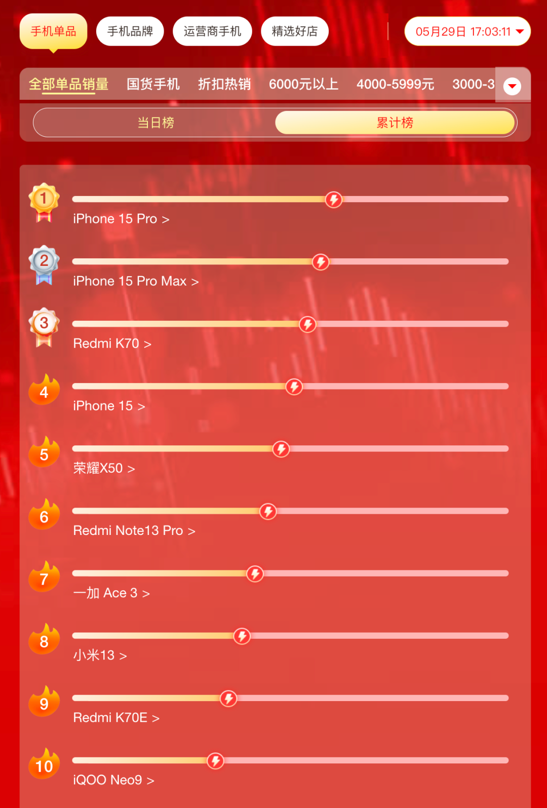 上图为京东平台统计的过去近10天累计销量排名 iPhone 15系列3款机型名列前茅。