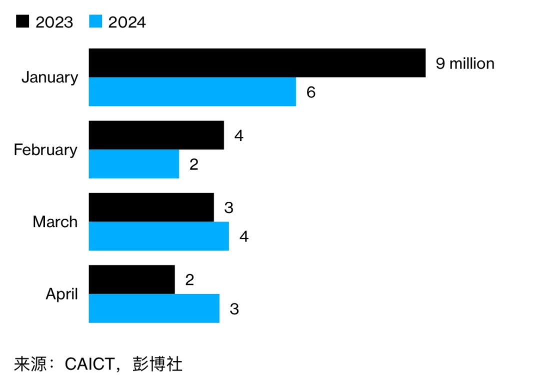 昨日,彭博社援引中国信通院4月智能手机数据对苹果这几个月的销量进行了分析报道。