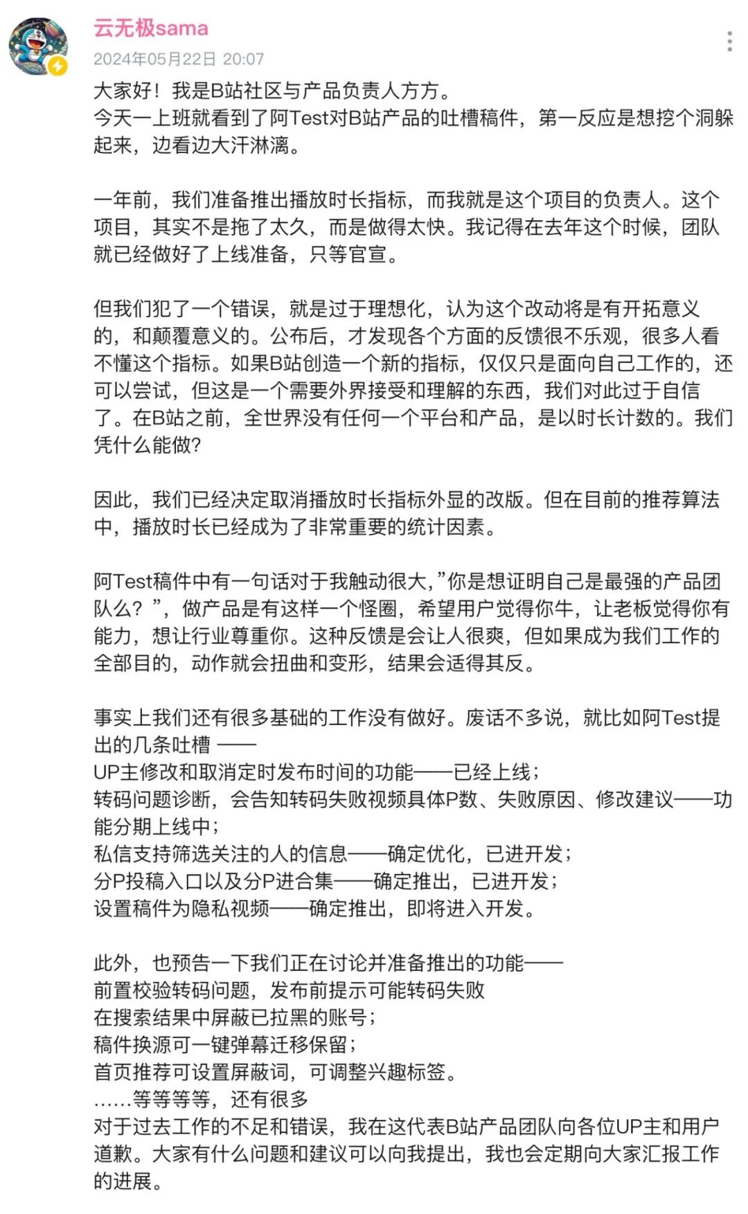 如上图所见,该负责人表示:一年前准备推出播放时长指标,他就是这个项目的负责人。这个项目,其实不是拖了太久,而是做得太快。去年这个时候,团队就已经做好了上线准备,只等官宣。但犯了一个错误,就是过于理想化,认为这个改动将是有开拓意义的,和颠覆意义的。公布后,才发现各个方面的反馈很不乐观,很多人看不懂这个指标。如果B站创造一个新的指标,仅仅只是面向自己工作的,还可以尝试,但这是一个需要外界接受和理解的东西,对此过于自信了。在B站之前,全世界没有任何一个平台和产品,是以时长计数的。因此,已经决定取消播放时长指标外显的改版。但在目前的推荐算法中,播放时长已经成为了非常重要的统计因素。