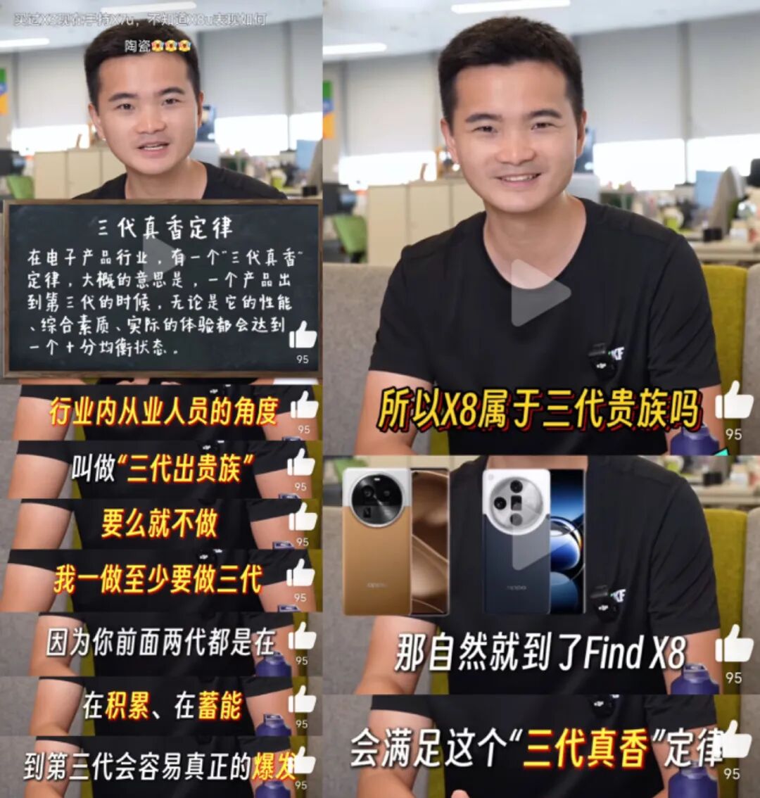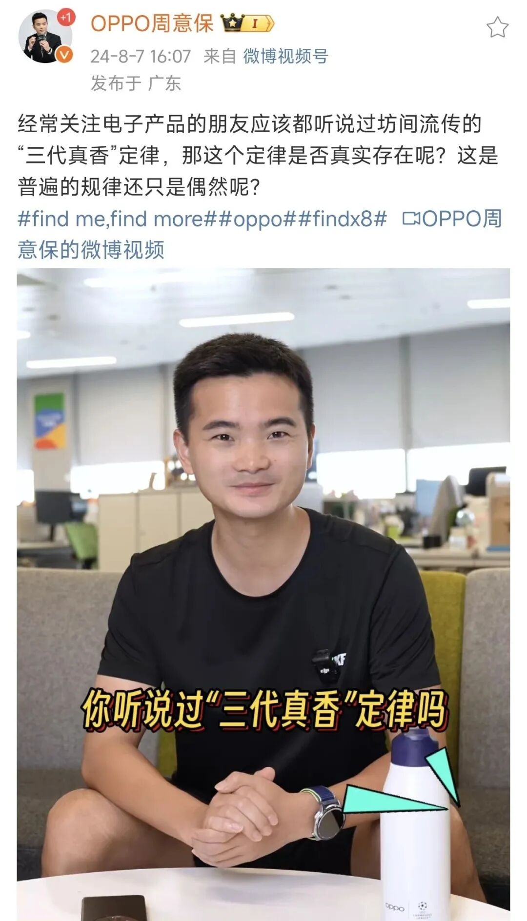 如上图所见,昨日OPPO Find系列产品负责人周意保在预热OPPO Find X8系列时称“坊间流传三代真香定律”。