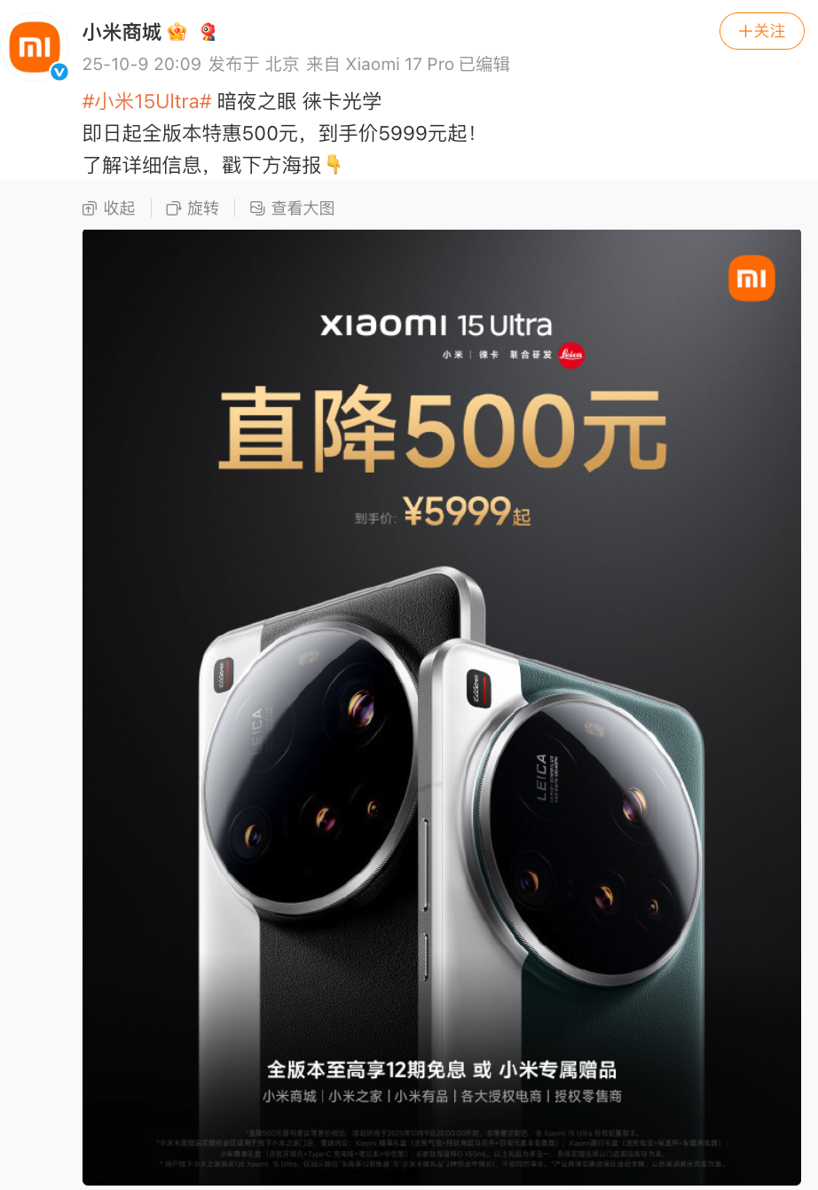 如上图所见,昨晚小米商城官方即日起小米15 Ultra全版本特惠500元,发售时是12+256GB 6499元起,现在降价后是5999元起;京东另外可领4000-500优惠券,到手后5499元起;如果所在地区有国补,则可以叠加再优惠500元,到手价4999元起。