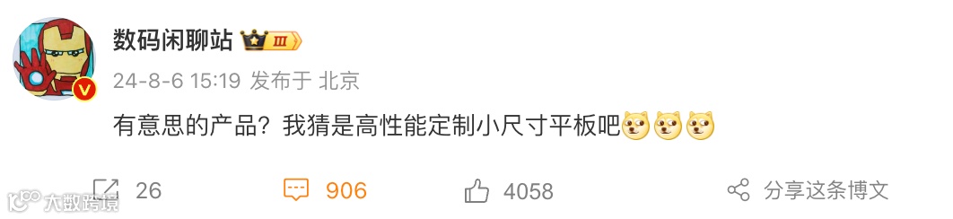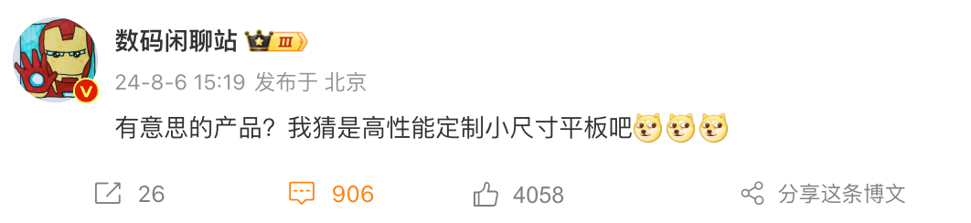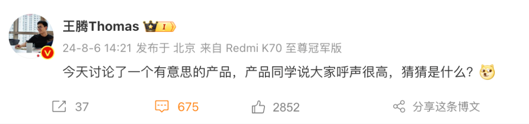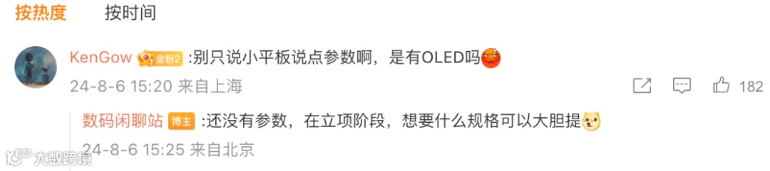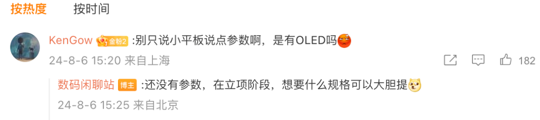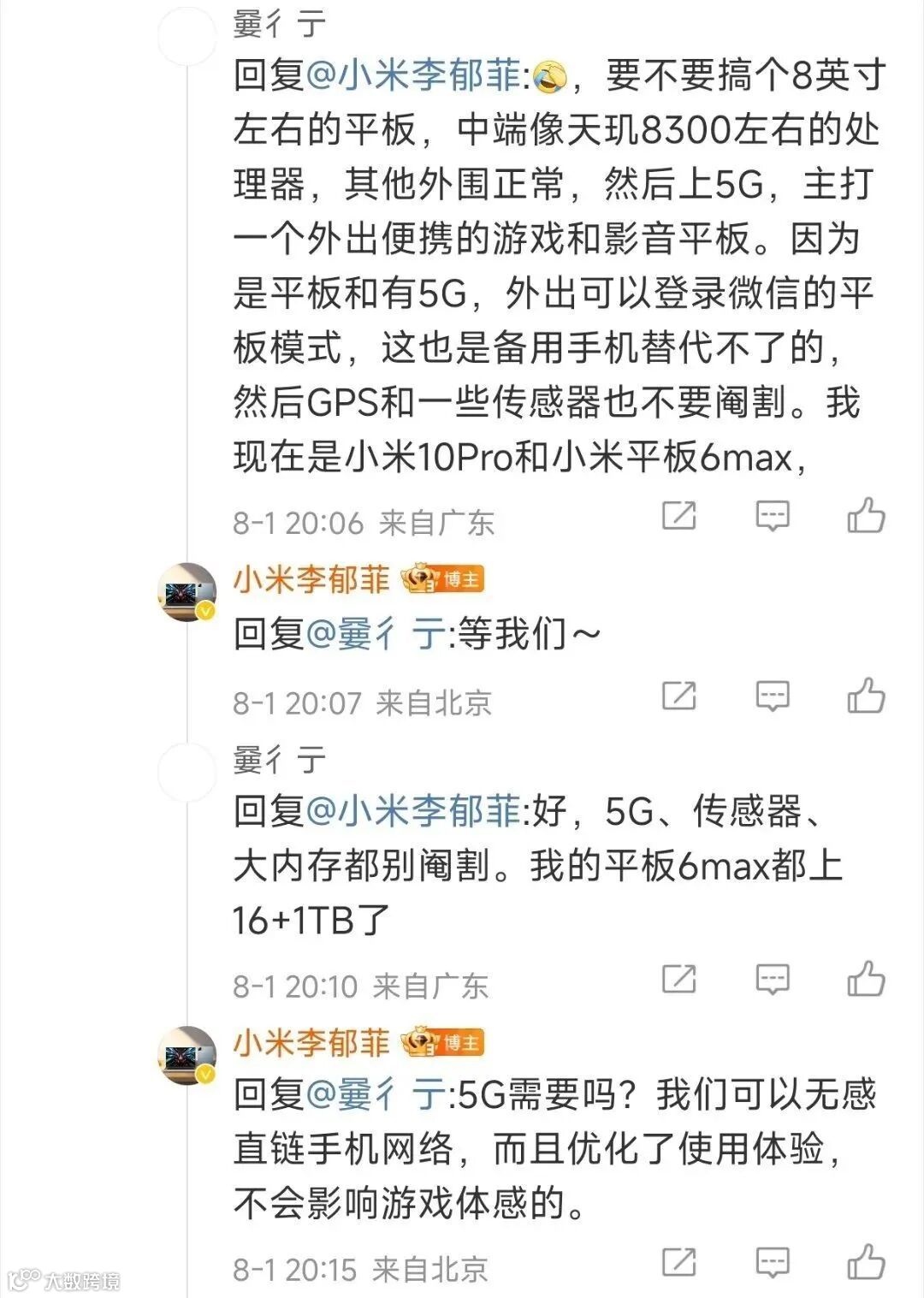 如上图所见,昨日小米中国区市场部副总经理、Redmi品牌总经理王腾在微博发文称「今天讨论了一个有意思的产品,产品同学说大家呼声很高,猜猜是什么?」不少网友都猜测是小尺寸平板,随后爆料达人数码闲聊站也进行了“隔空互动”,暗示为高性能定制小尺寸平板,并称目前立项阶段,配置并未确定,预计会隶属于“子系”也就是Redmi旗下。
