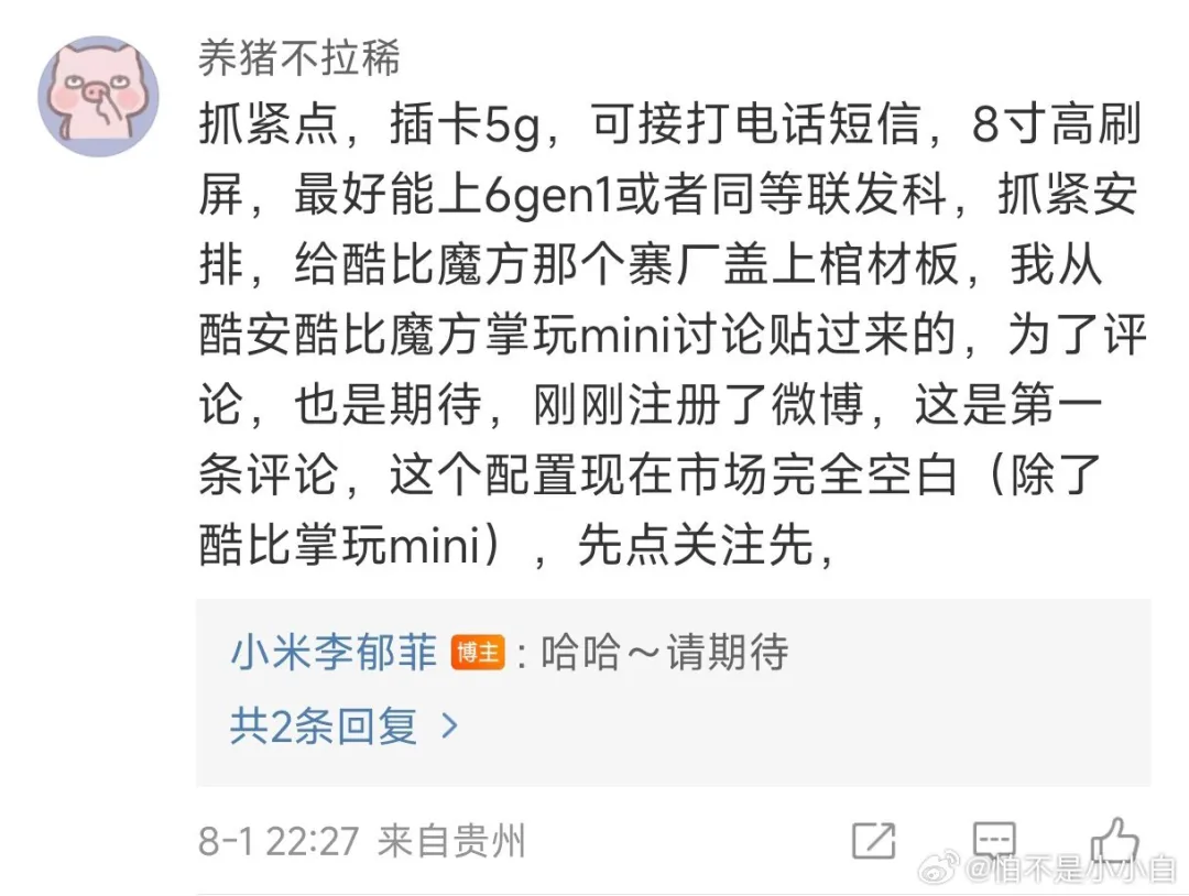 作为补充,前几天小米笔记本和平板产品运营部总经理李郁菲也曾在微博和网友互动调研大家对小尺寸平板的需求,从其回复的评论来看:小米的小尺寸平板“不会太久”,可能在8英寸左右。问问大家,你理想中的小尺寸平板配置应该什么样?