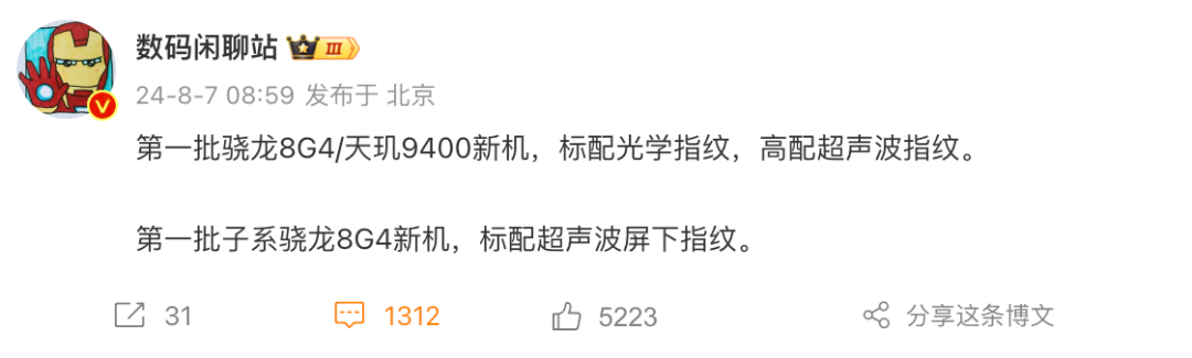 据数码闲聊站爆料:第一批骁龙8 Gen4、天玑9400新机的标准版或均为光学指纹,高配超声波指纹;而第一批“子系”骁龙8 Gen4新机则将标配超声波屏下指纹。如果消息属实,这也算是“子系”品牌真越级了🤔