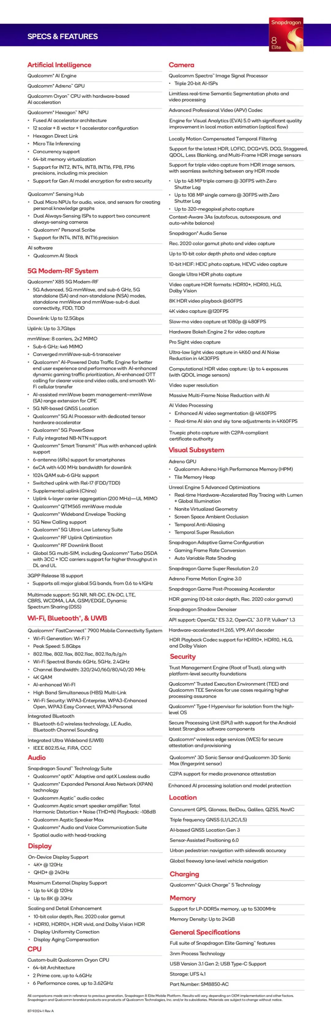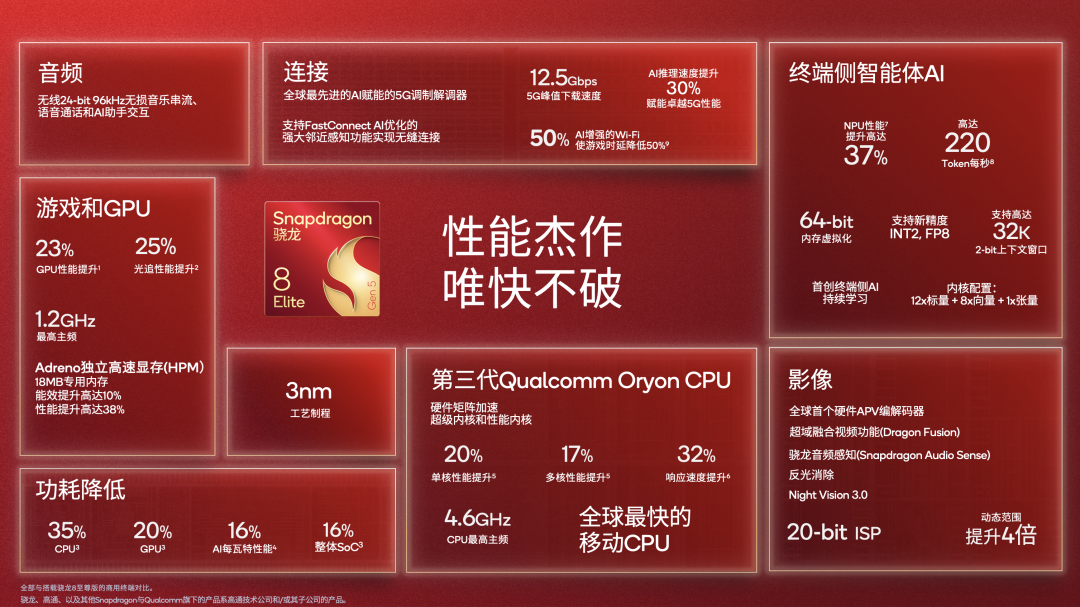“中兴、Xiaomi、vivo、索尼、三星、ROG、红魔、REDMI、realme、POCO、OPPO、一加、努比亚、iQOO和荣耀等全球OEM厂商和智能手机品牌将在其旗舰产品中采用第五代骁龙8至尊版,全新终端将在未来几天陆续发布。”
