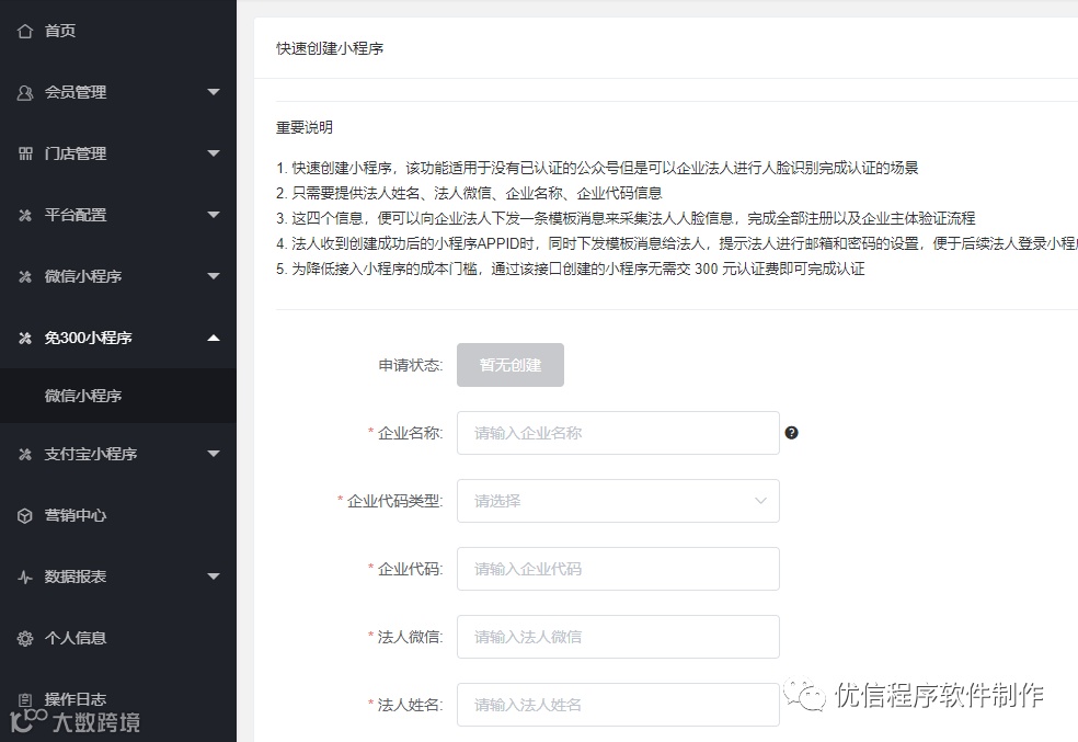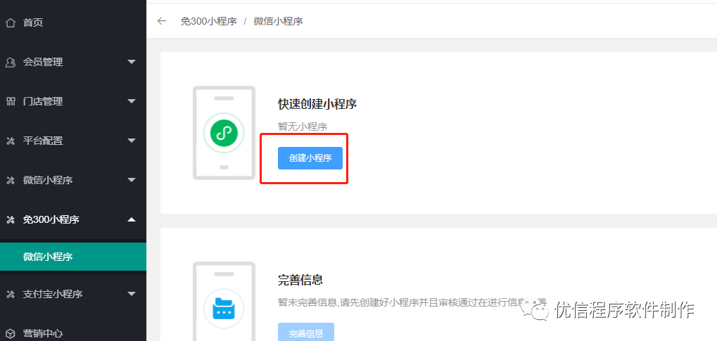 第三步:点击左侧免300小程序-微信小程序,进行创建小程序。