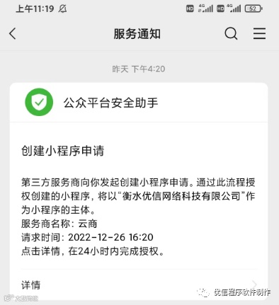 创建好后,微信会受到一条消息,按着步骤在微信端完成授权就可以。小程序就创建好了,这个小程序是免300认证费的。