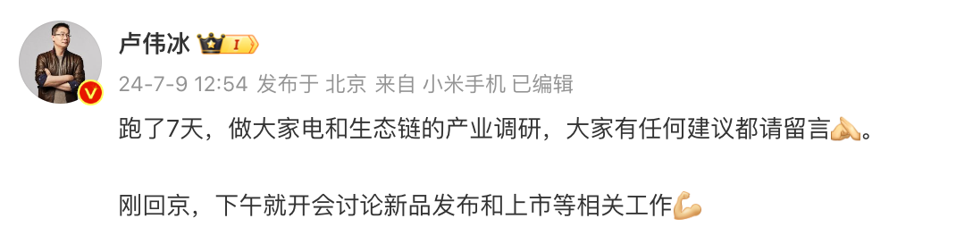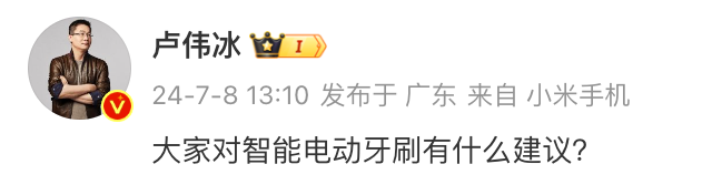 专注小米汽车业务的雷军这里就不提了,毕竟雷总主要负责汽车业务。小米中国区市场部副总经理、Redmi品牌总经理王腾的微博陆续有更新和Redmi K70至尊版新机相关的预热或用户互动。还算正常。而小米集团合伙人/总裁、国际部总裁、小米品牌总经理卢伟冰似乎最近的工作重心在大家电和生态产品,本周在微博陆续调研了大家对米家净水器、电饭煲、电动牙刷等产品的建议。