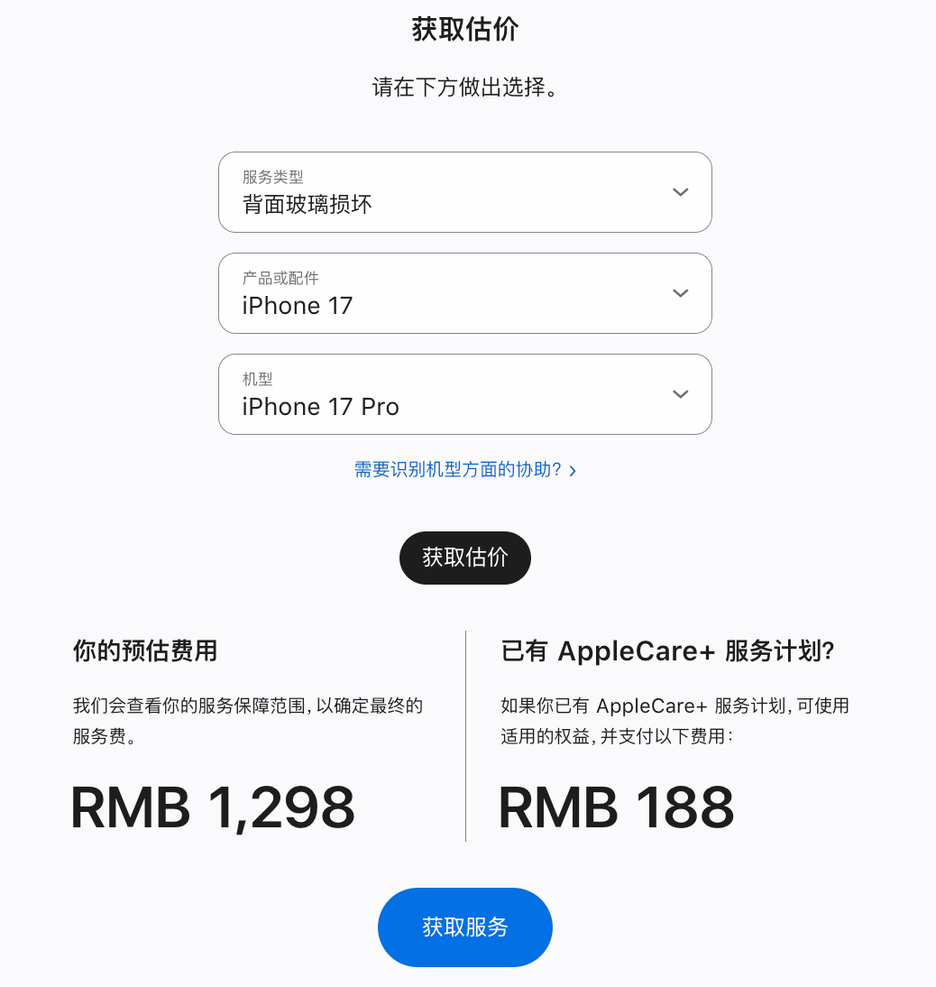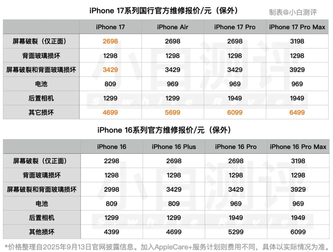 今日苹果iPhone 17系列3款机型正式上市,随着产品到店不少感兴趣的消费者纷纷到店体验真机,有部分网友反馈门店的iPhone 17 Pro系列展示机(主要是蓝色)后盖划痕明显,今天就整理下官方的维修费用,提前看看维修价格如何~