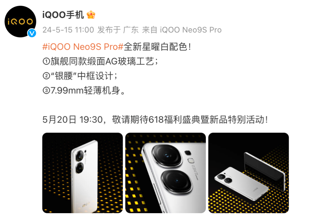 据官方预热,iQOO将于5月20日19:30举行618福利盛典暨新品特别活动,届时将正式发布 iQOO Neo9S Pro,外观方面,目前官方公布了Neo9S Pro的「星曜白」配色,居中单挖孔直屏、旗舰同款缎面AG玻璃工艺、银色直角中框,机身厚度为7.99mm。