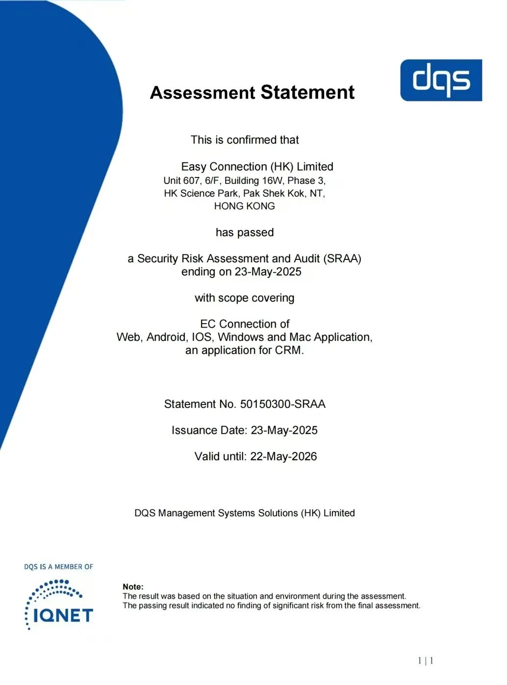 近日,EC香港公司正式通过香港政府严格要求的安全风险评估与审核(SRAA) ,斩获官方合格报告!