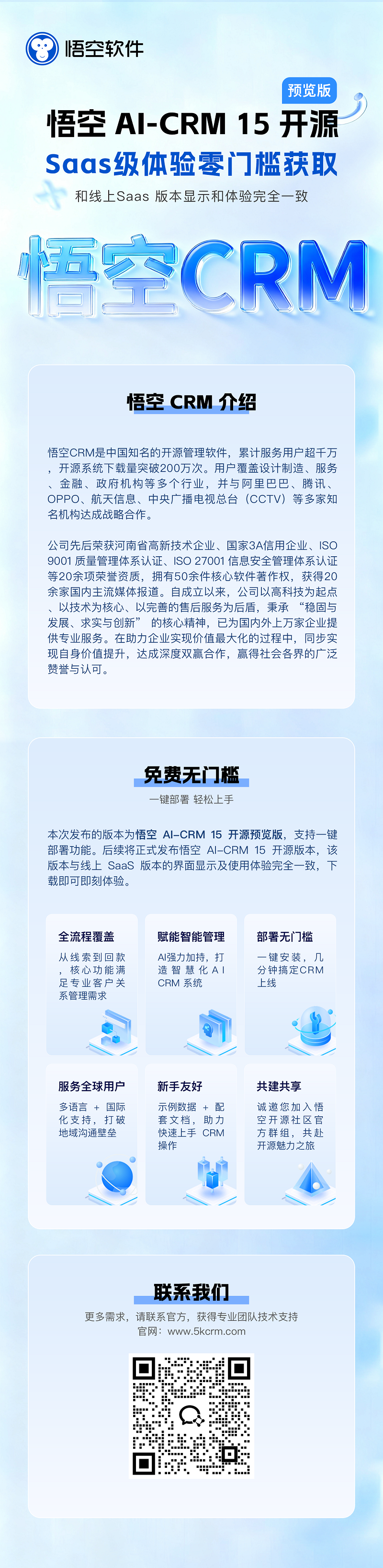 一键部署AI CRM系统,显著提高企业销售收入。 功能体验:https://www.72crm.com 一键部署:https://www.5kcrm.com/ai_crm 论坛讨论:https://bbs.72crm.com/