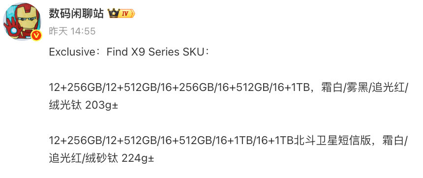 如上图所见,爆料达人数码闲聊站暗示,Find X9将提供霜白、雾黑、追光红、绒光钛4个配色,12+256GB、12+512GB、16+256GB、16+512GB、16GB+1TB共5个存储版本,机身重约203g。