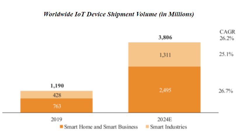 物联网产品的赛道肯定是火热的,预计未来5年的年复合增长率在26.2%