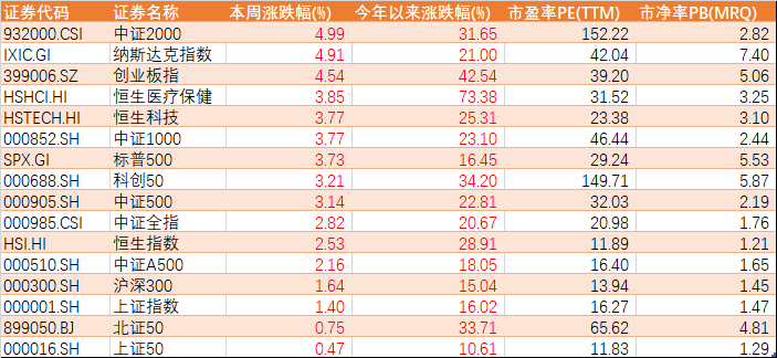 本周A股所有主要指数均有不同程度反弹,外围港股市场同步反弹,涨幅与A股相近。具体来看,本周中证2000、创业板指领涨,涨幅超过4%;上证50、北证50涨幅较小,均不到1%。从个股上看,上涨比例达到83%,个股中位数涨幅达到3.13%,本周投资者收益较好,但并未大举加仓,对反弹持续性仍存疑。
