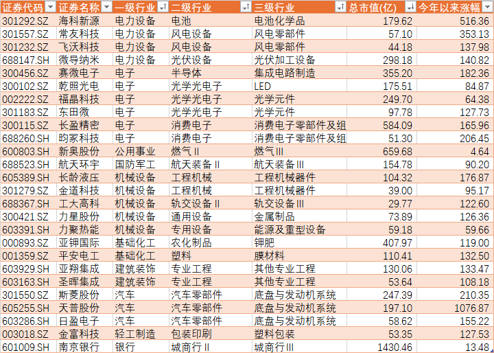 如果只考虑今年以来涨跌幅,那么创下年内新高个股有122只,比上周47只上升明显,结构化行情继续。