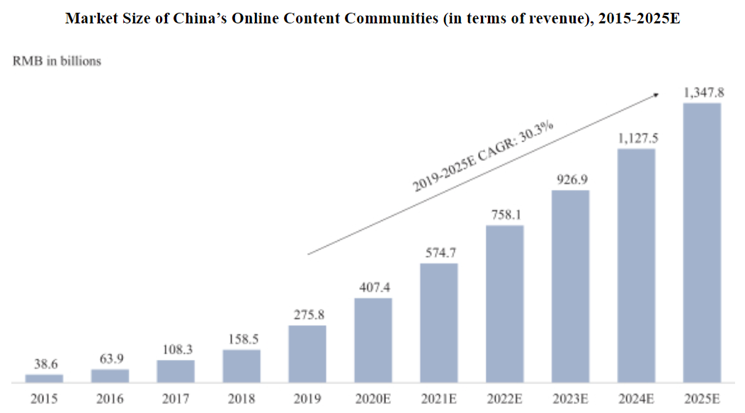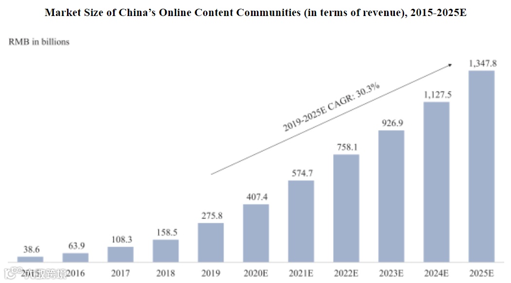 线上内容社群的赛道,从收入看,从2015年的386亿增长到2019年的2758亿,并且预计到2025年会达到1.3万亿,折合年复合增长率为30.3%,赛道算是不错的