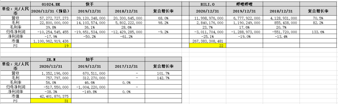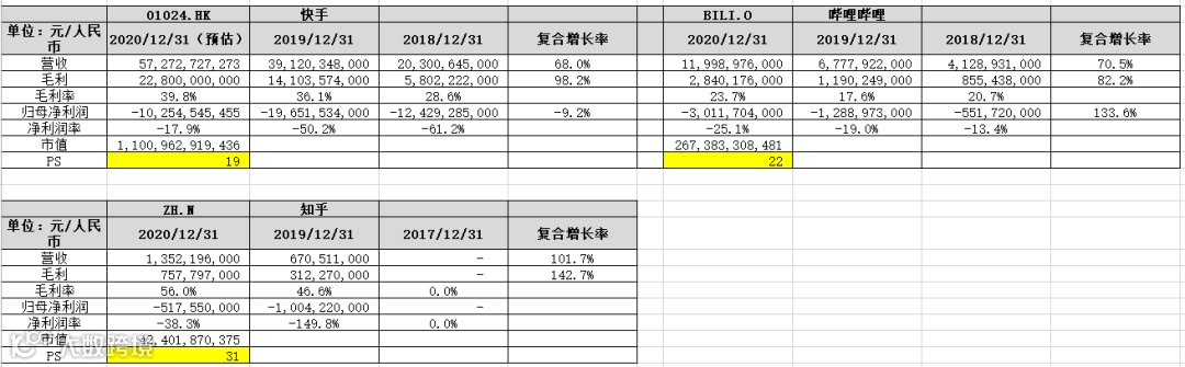 假如顶格定价,公式市值420亿人民币,对应2020年营收是13亿人民币,PS为31倍;肯定是不低了;与此对比,另外2家明星互联网公司快手和哔哩哔哩,PS都在20倍左右。估计是知乎目前营收的基数还不高,加上20年对比19年翻了个倍,大家觉得其高速增长依然可以维持,所以给了这么个估值