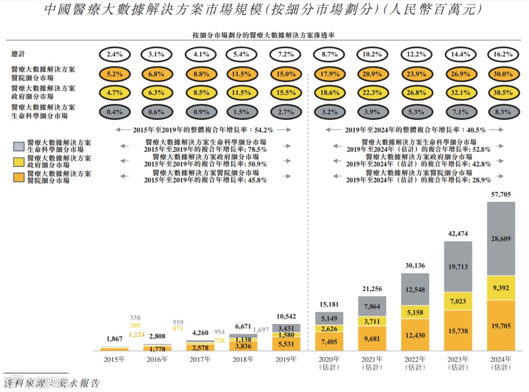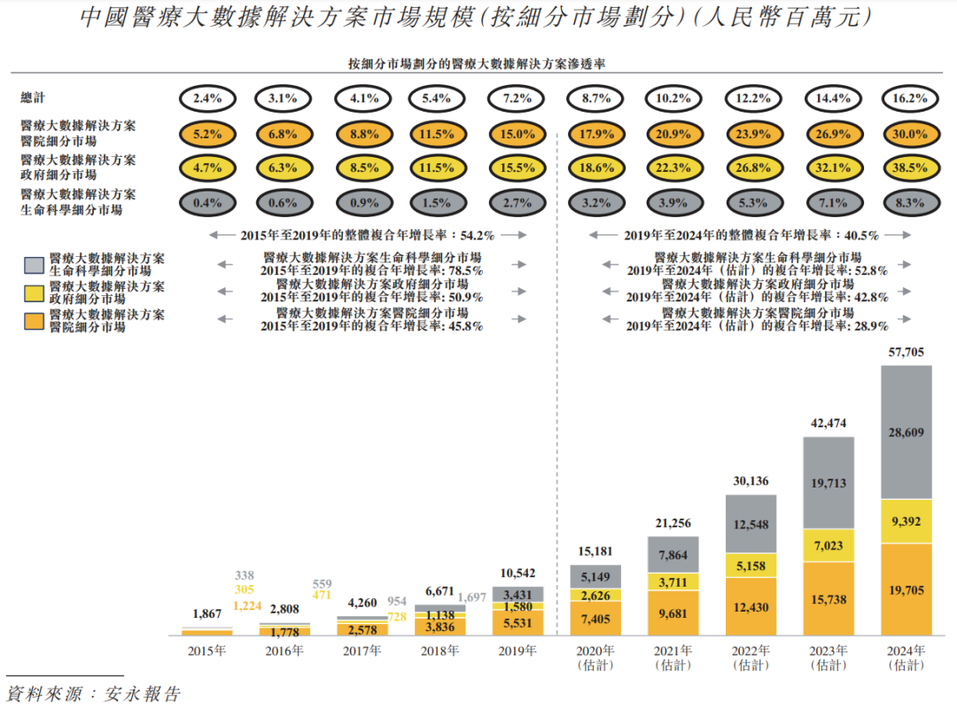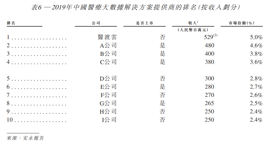 根据安永报告,按收入计,公司在2019年所有医疗大数据解决方案提供商中排名第一,占市场份额的5.0%。