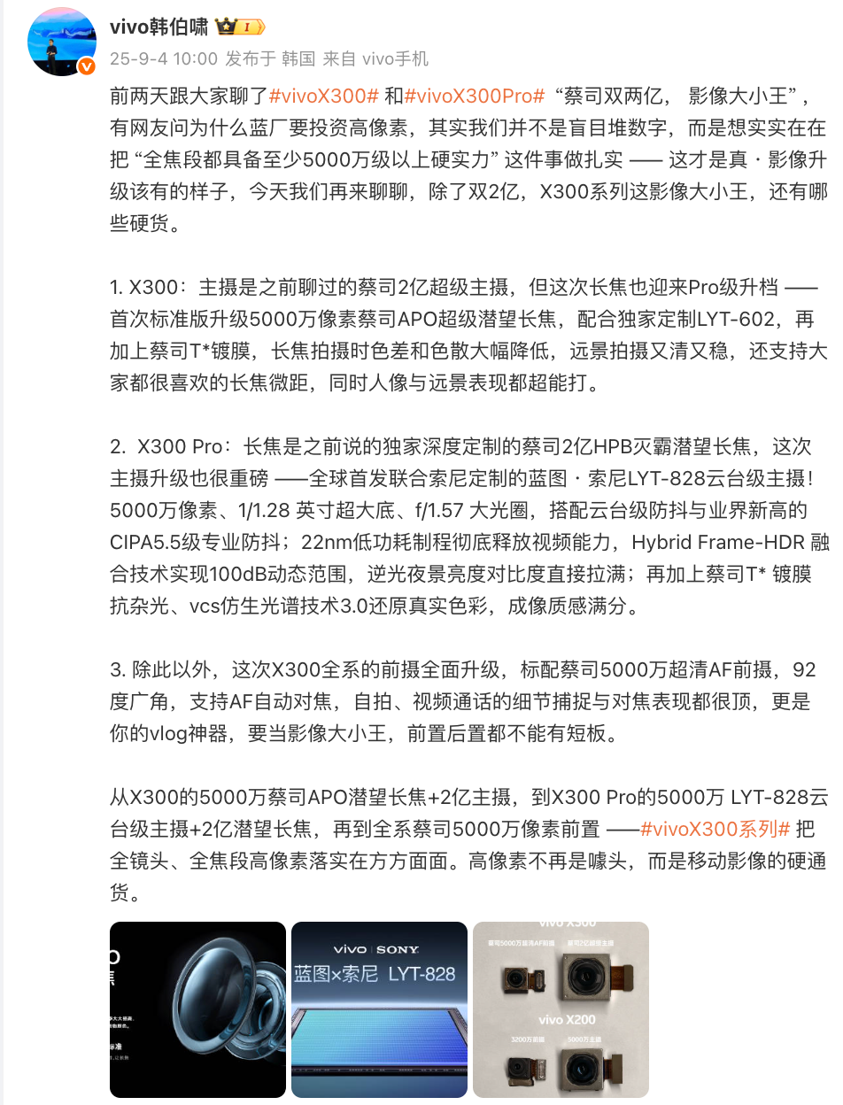 如上图所见,vivo产品经理韩伯啸表示vivo X300系列