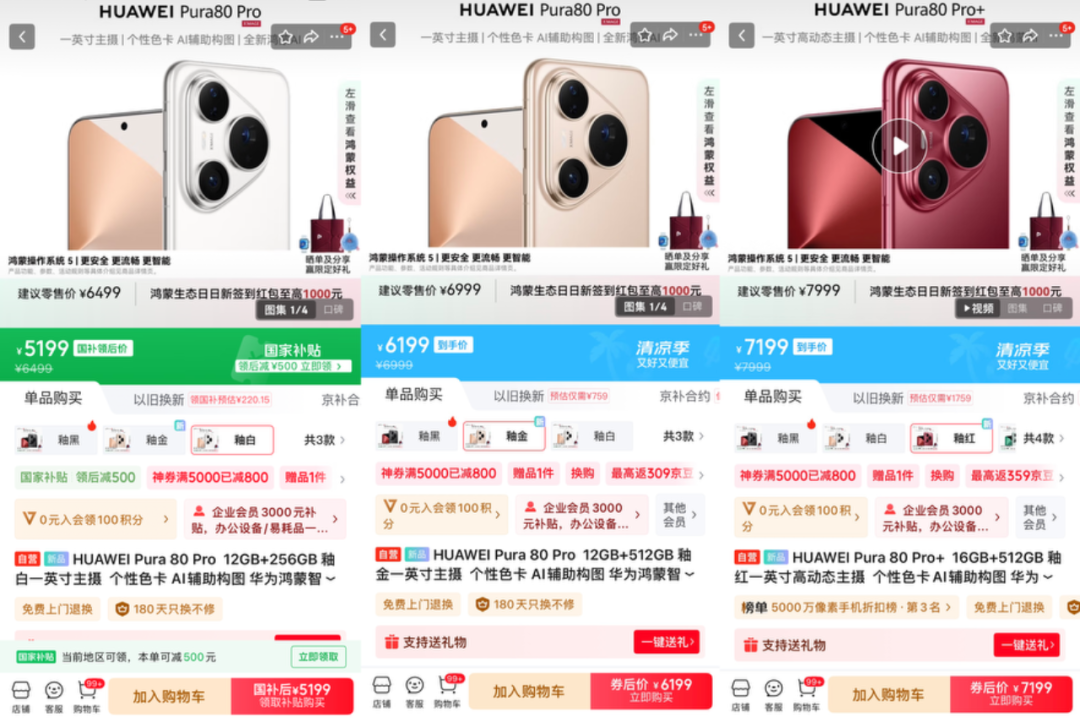 6月11日华为发布了新一代Pura 80系列,带来了Pura 80、Pura 80 Pro、Pura 80 Pro+、Pura 80 Ultra多款型号,其中Pura 80 Pro和Pro+于6月14日上市,现据最新消息,上市不到一个月,电商平台直降800元起。