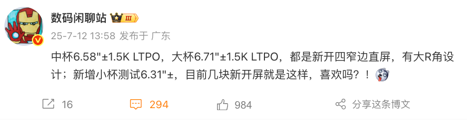 据爆料达人数码闲聊站暗示:荣耀Magic8系列有多款型号,屏幕尺寸似乎有3个杯型,中杯Magic8是6.58英寸左右的1.5K LTPO中屏,大杯Magic8 Pro是6.71英寸左右的1.5K LTPO常规尺寸,都是新开四窄边直屏,大R角设计。同时另外有一款小杯(命名暂未确定)正在测试6.31英寸左右的相对小直屏。