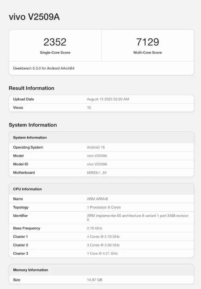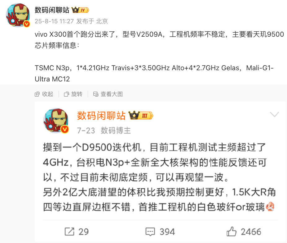 首先是天玑9500这边,今日vivo有一款型号为V2509A的新机跑分首次现身,消息称其隶属于vivo X300系列,同时vivo X300系列或将首发搭载联发科天玑9500处理器。(PS.除了vivo X300系列,OPPO Find X9系列预计也会首批搭载天玑9500)