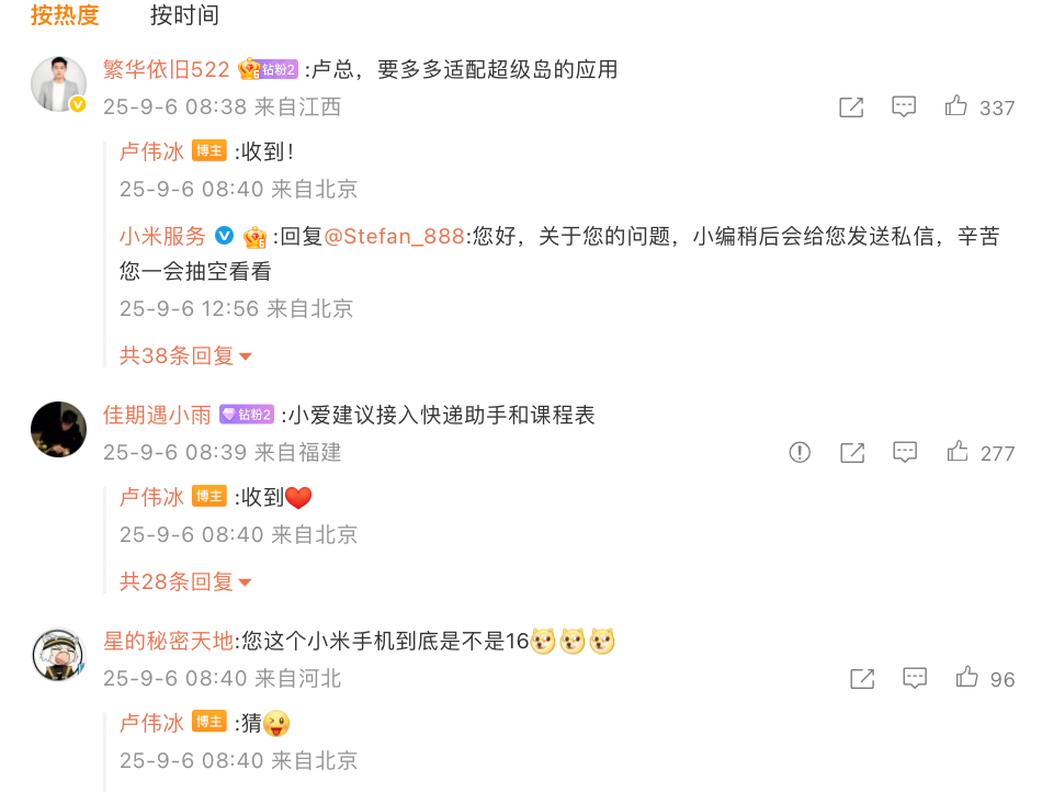 在收集建议的微博下,有网友留言希望多多适配超级岛的应用、小爱建议接入快递助手和课程表等,卢伟冰均进行了回复表示“收到”,另外原微博来源是“小米手机”,未露出机型还被猜测是不是小米16,大家觉得是吗?