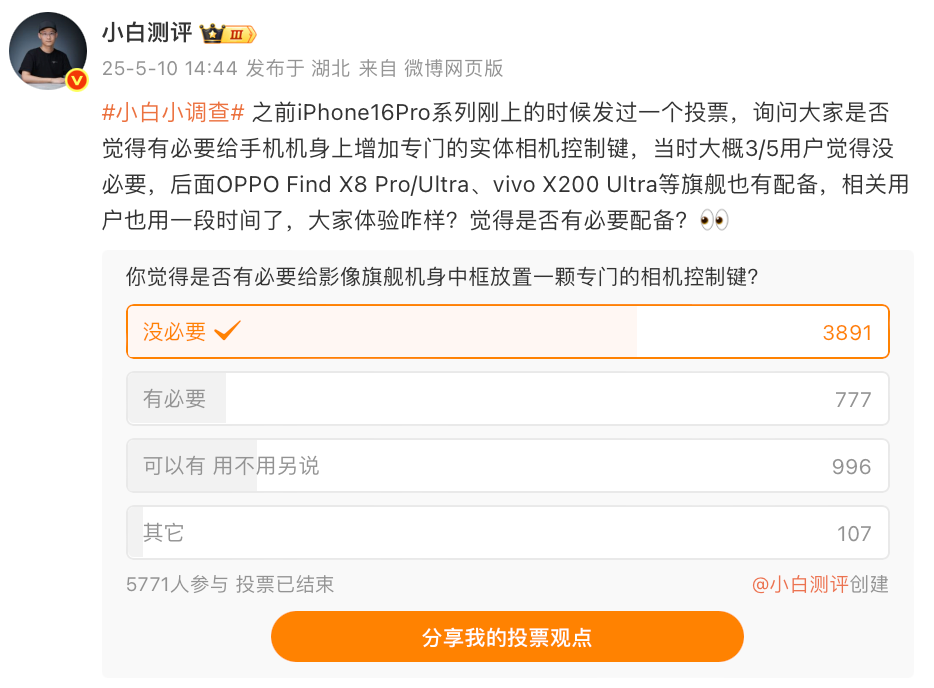 值得一提的是,之前我们还在微博发过投票询问粉丝对影像旗舰给机身单独放颗拍照键的看法,有不少人觉得没必要,正在用iPhone 16系列、OPPO Find X8 Pro/Ultra、vivo X200 Ultra的用户也可以留言说说自己使用率高不高~
