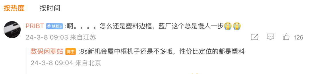 细节上值得注意的是,爆料还提到接下来这批骁龙8s Gen3新机金属中框不多,定位性价比的机型都是塑料中框。目前了解到真我GT Neo6、小米Civi 4应该也会搭载骁龙8s Gen3处理器,其它家应该也有相关新机,到时候新一轮中端新机混战也要来了~要换机的小伙伴可以蹲蹲这波新机。