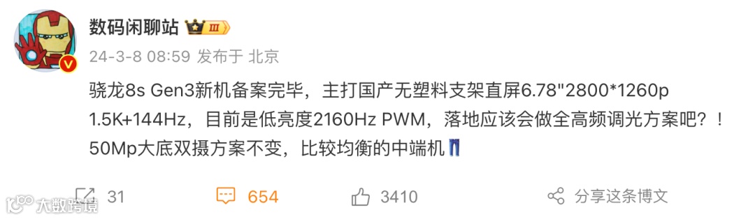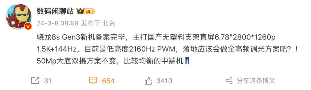 据爆料,iQOO Neo9系列新机将搭载骁龙8s Gen3处理器,采用6.78英寸2800*1260分辨率的1.5K国产OLED直屏,144Hz屏幕刷新率,屏幕没有塑料支架,目前为低亮度2160Hz PWM调光方案,预计落地应该会做全高频调光,同时依旧采用50MP大底双摄方案,整体算是比较均衡的中端机。(*猜测这款机应该命名为Neo9S或者Neo9S Pro?)