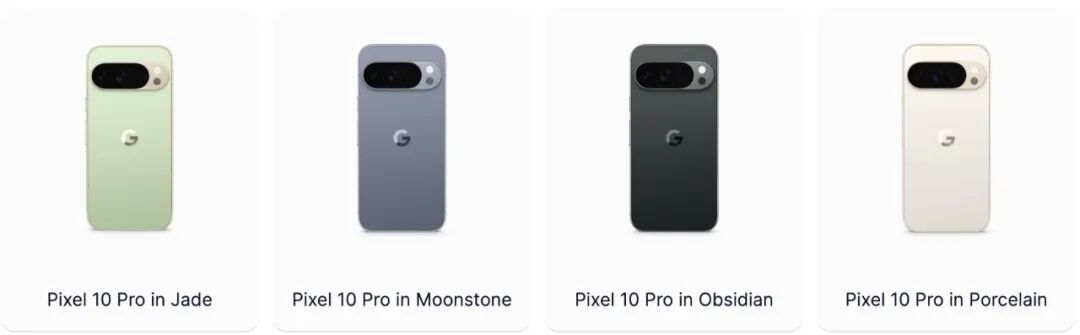 【谷歌Pixel 10 Pro】6.3英寸2856*1280分辨率1-120Hz LTPO OLED屏,峰值亮度3300nit,康宁大猩猩玻璃 Victus 2玻璃盖板,月岩灰、绿玉色、陶瓷米、曜石黑4个配色,机身三围152.8*72*厚约8.6mm,重约207g,前置42MP,后置三摄①50MP主摄②48MP超广角 ③48MP 5X长焦,搭载谷歌Tensor G5处理器,Titan M2安全辅助芯片,4870mAh电池,30W有线充电,最高15W的Pixelsnap磁吸无线充电(Qi2认证),16+128GB版售价999美元,16+256GB版1099美元,16+512GB版1219美元,16GB+1TB版1449美元。