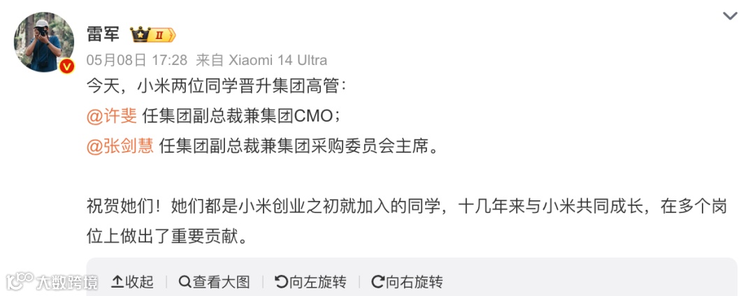 作为补充,雷军介绍本次晋升的两位高管都是小米创业之初就加入的,在多个岗位上做出了重要贡献。许斐是小米的第46号员工,早年间有一则表情包流传,之前主持小米14 Ultra发布会,一口流利的脱稿演讲让人印象深刻,也被粉丝亲切地称为“许婶”。张剑慧则曾担任小米之家总经理。小米这波人事调整,你对哪位印象最深?