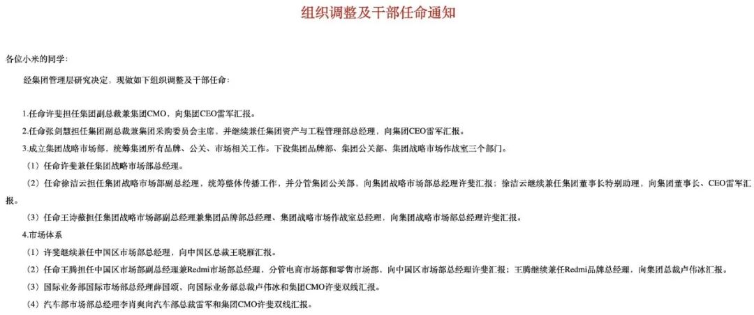 此外,小米还成立了集团战略市场部,统筹集团所有品牌、公关、市场相关工作,许斐兼任集团战略市场部总经理;徐洁云担任集团战略市场部副总经理,统筹整体传播工作,并分管集团公关部,继续兼任集团董事长特别助理;王诗薇担任集团战略市场部副总经理兼集团品牌部总经理、集团战略市场作战室总经理。另外市场体系也有些需调整,如任命王腾担任中国区市场部副总经理兼Redmi市场部总经理,分管电商市场部和零售市场部。