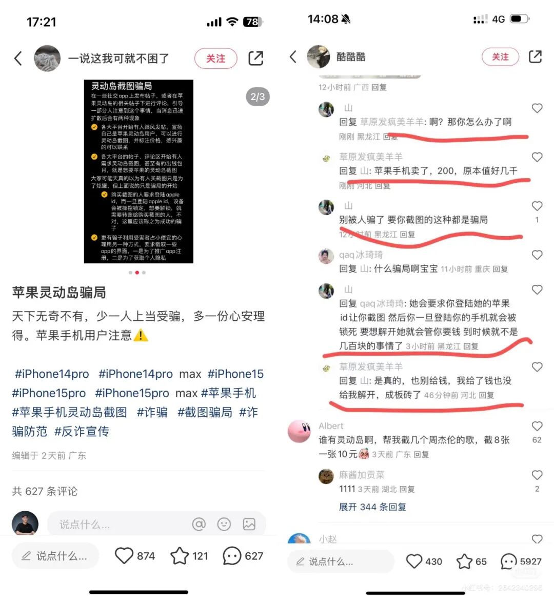 但后续有部分网友反馈,求购灵动岛截图的人还存在诈骗份子,比如为了“展示这款手机是自己的”,提出要求希望可以登录自己的Apple ID,在Apple ID界面截图。当卖家按要求登录后,买家可能远程锁机,从而勒索诈骗该用户一定金额。