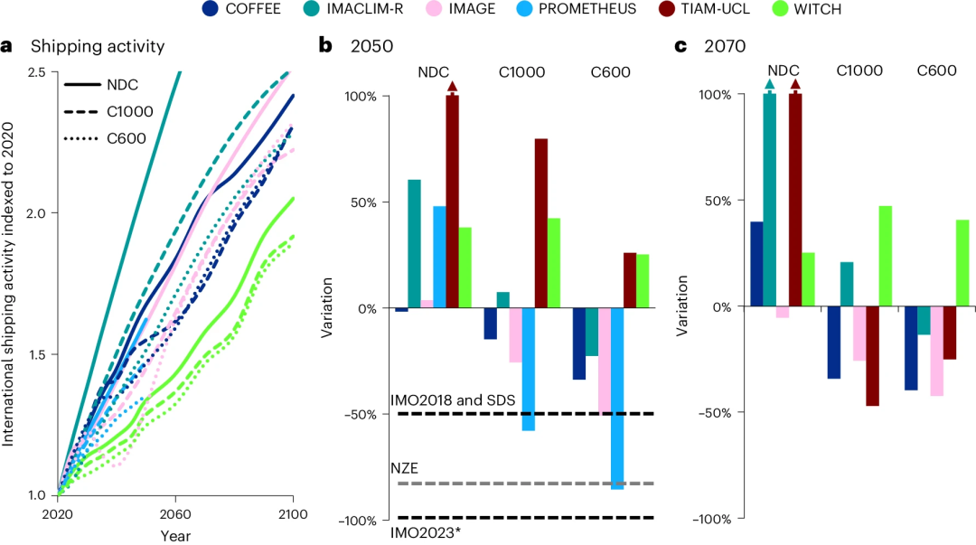 摘要 :航运脱碳已成为一个重要的政策目标。尽管集成评估模型(IAMs)通常用于探索气候缓解策略,但它们通常对国际航运提供的信息较少,而国际航运大约占全球二氧化碳排放的 0.7 GtCO2 每年。在此,我们进行了一项多模型集成评估分析,探讨国际航运的脱碳潜力,并展示了未来几十年内减少年排放量的可能性,预计到 2050 年可减少最多 86%。这一减少主要通过低碳燃料的应用来实现。那些代表多种潜在低碳替代品的模型通常表现出更深入的脱碳路径,其中可替代传统航运燃料的主要低碳选项包括生物燃料、可再生酒精和绿色氨。虽然我们的结果与国际海事组织 2018 年提出的减排目标一致,但其与该机构修订后的目标的兼容性仍需要进一步明确的解释。
