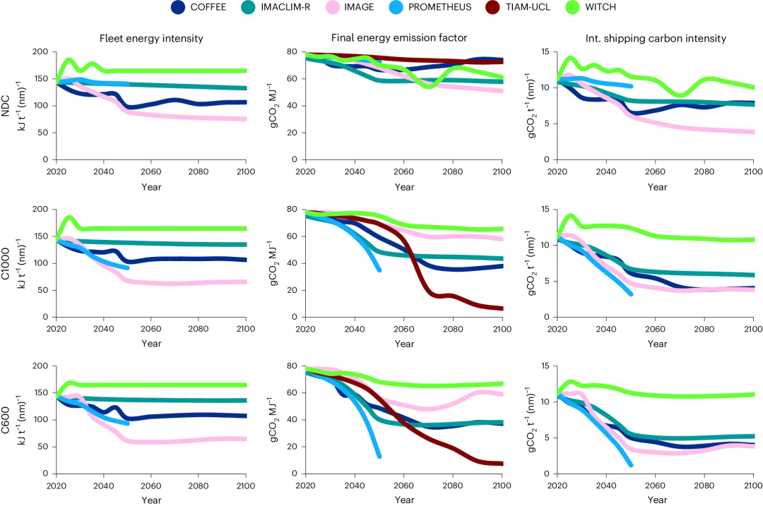 研究设计三类情景揭示气候政策强度差异:NDC情景延续各国自主贡献承诺至2100年,作为无强化气候行动的基准;C1000与C600情景分别施加2020-2100年累计1000/600 GtCO₂的硬性碳预算,且排除负排放技术抵偿。所有情景均基于SSP2中等发展路径,统一人口、经济与技术进步假设,确保跨模型可比性。碳预算约束通过内生碳价机制传导至航运部门,驱动模型在燃料替代、能效提升等技术组合中寻求成本最优解,其中C600情景对应1.5°C温控目标的严格排放上限。这种情景架构既检验现有政策力度下的排放轨迹,又量化深度脱碳对航运能源系统重构的要求,为IMO目标实现提供多模型证据支撑。