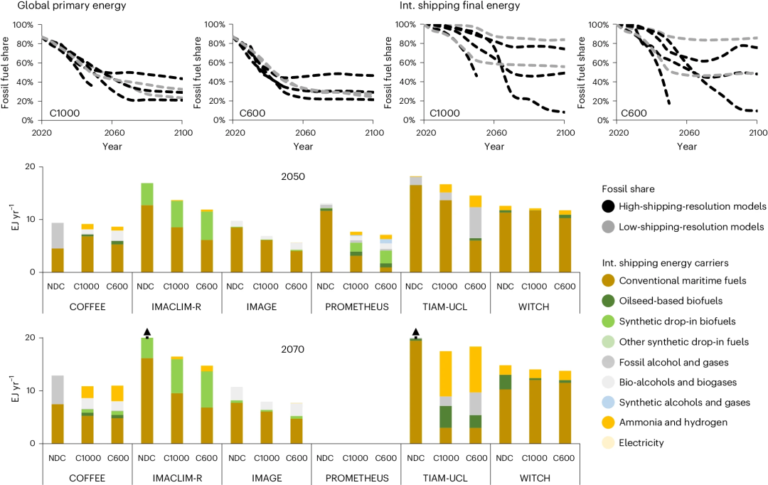 作为脱碳难点行业,航运在深度减排情景中仍保有较高化石能源比重。C600 情景下,高分辨率模型(如 PROMETHEUS)显示 2070 年航运化石燃料占比 40–51%,而低分辨率模型(如 TIAM-UCL)则达 46–84%。其中 IMAGE 模型独特性凸显:通过激进能源强度削减(2050 年强度降幅达 60%),其 C600 情景下航运能源需求大幅降低,但化石燃料占比仍超 60%,反映该模型更依赖存量船舶能效提升而非燃料彻底转型。这一结果揭示了模型技术细节对脱碳路径设计的深刻影响——高分辨率模型通过细化船舶类型与燃料替代选项,可挖掘更深减排潜力;低分辨率模型则因技术表征不足,易高估化石能源惯性。