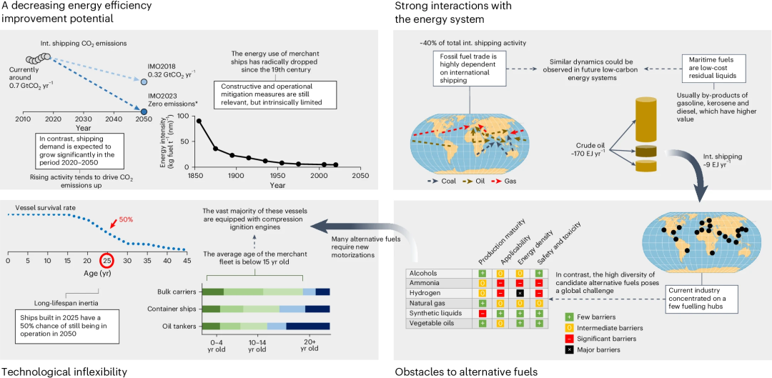 研究背景: 近年来,海运作为全球二氧化碳排放的主要来源之一,约占全球年排放量的 2.8%。国际航运的排放量约占海运排放的 70%,这使得全球气候变化应对策略中,航运脱碳成为一个关键议题。为此,国际海事组织(IMO)制定了一系列政策,旨在提高航运的能源效率,并设定了到 2050 年减少至少 50%温室气体排放的目标。然而,由于船舶依赖化石燃料,单纯的能源效率提升不足以实现深度脱碳。低碳燃料成为航运减排的关键选项,但涉及燃料生产、动力系统和加油基础设施等多方面挑战。