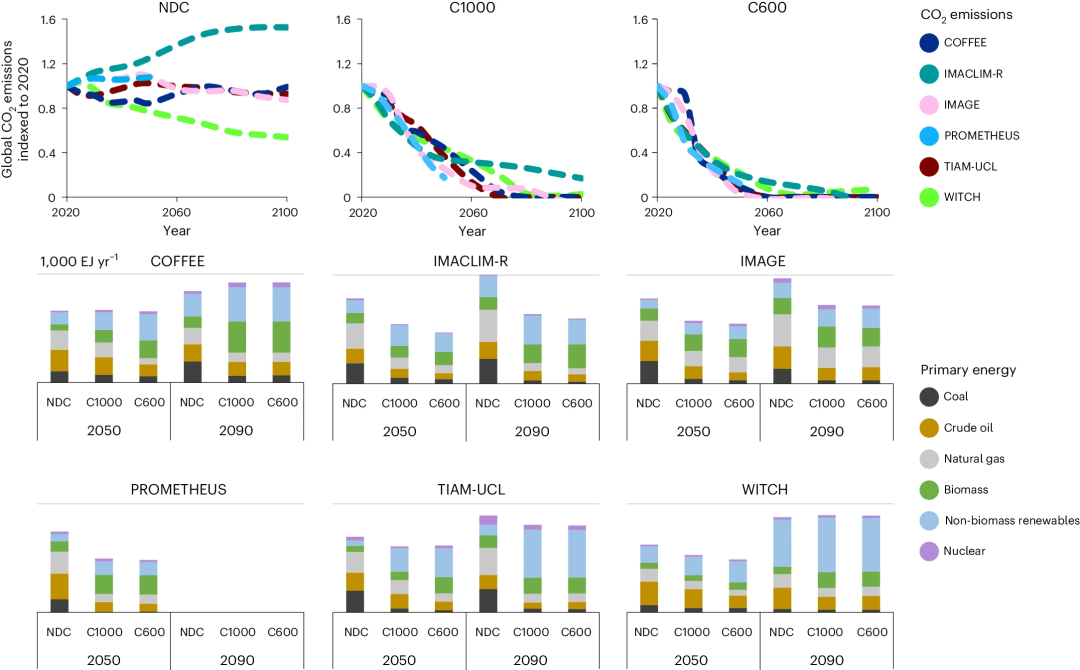 如图2所示,全球排放情景分析显示不同情景间的结果差异总体大于模型间的差异(NDC情景除外),其中IMACLIM-R与WITCH模型的差异尤为显著。这种分歧源于技术路径分类的复杂性——部分传统深度减排路径可能被视为当前趋势的延续,例如WITCH模型在NDC情景中预测2050年风能/太阳能初级能源需求将突破150 EJ年−1,凸显可再生能源电气化在现行政策中的潜力。相比之下,碳预算情景(C1000和C600)呈现更统一的减排模式,其核心策略包括:加速可再生电力部署、遏制森林砍伐、降低能源需求、提升能效以及生物燃料/电子燃料替代化石能源。此外,这两个情景均依赖生物能源碳捕集(BECCS)和直接空气碳捕存(DACCS)等负排放技术的规模化应用(详见补充部分5)。
