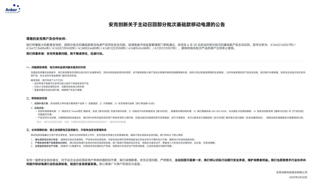 Anker安克召回型号为:A1642(143327件)/A1647(134854件)/A1652(109450件)/A1680(24480件)/A1681(223558件)/A1689(45438件)/A1257(31857件)。
