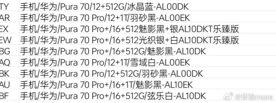 首先是具体版本,网传华为Pura 70系列将带来Pura 70、Pura 70 Pro、Pura 70 Pro+、Pura 70 Ultra四款型号,SKU有①Pura 70:12+512GB 冰晶蓝/羽砂黑/雪域白/樱玫红;②Pura 70 Pro:12+512GB/12+1TB 雪域白/罗兰紫/羽砂黑;③Pura 70 Pro+:16+512GB/16+1TB 光织银/弦乐白/魅影黑/乐臻版;④Pura 70 Ultra:16GB+1TB 陶瓷白/陶瓷黑 。