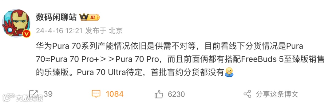 至于首销版本,数码闲聊站爆料称「华为Pura 70系列产能情况依旧是供需不对等,目前线下分货情况是Pura 70≈Pura 70 Pro+>>Pura 70 Pro,而且前面两个型号都有搭配FreeBuds 5至臻版销售的乐臻版。Pura 70 Ultra待定,首批盲约分货都没有。」