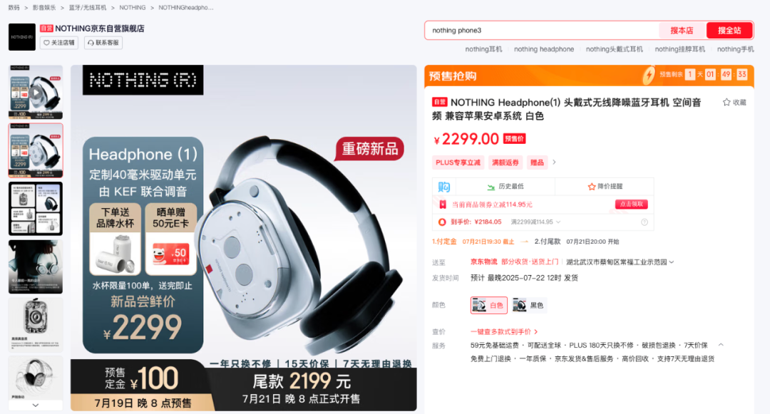 如上图所见,Nothing Headphone(1)国行售价2299元,目前已经开启预售,将于7月21日晚上8点正式开售。