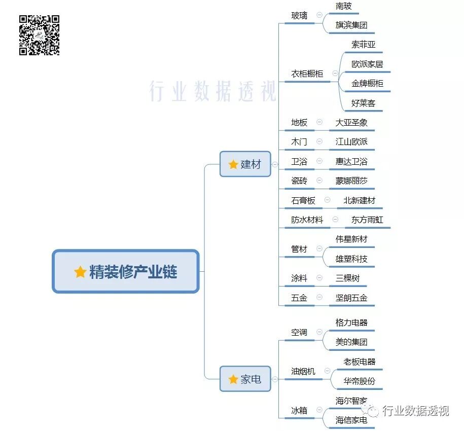 之前我们对于建筑材料、轻工制造以及家电行业做了梳理,详见建筑材料行业分析 行业筛选系列(三)、轻工制造行业分析 行业筛选系列(四)、家电行业分析 行业筛选系列(五)。对精装产业链有了较为深入的认识,下图是我对于精装产业链各个细分行业龙头的概括,已经剔除了不符合投资要求的公司。