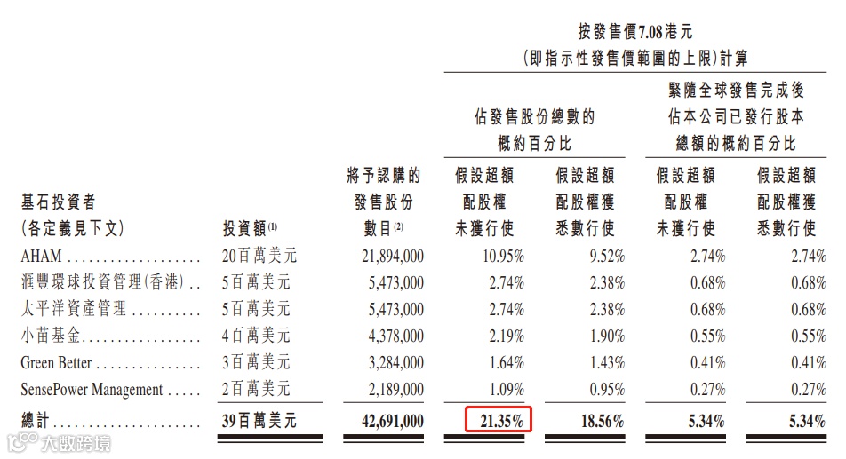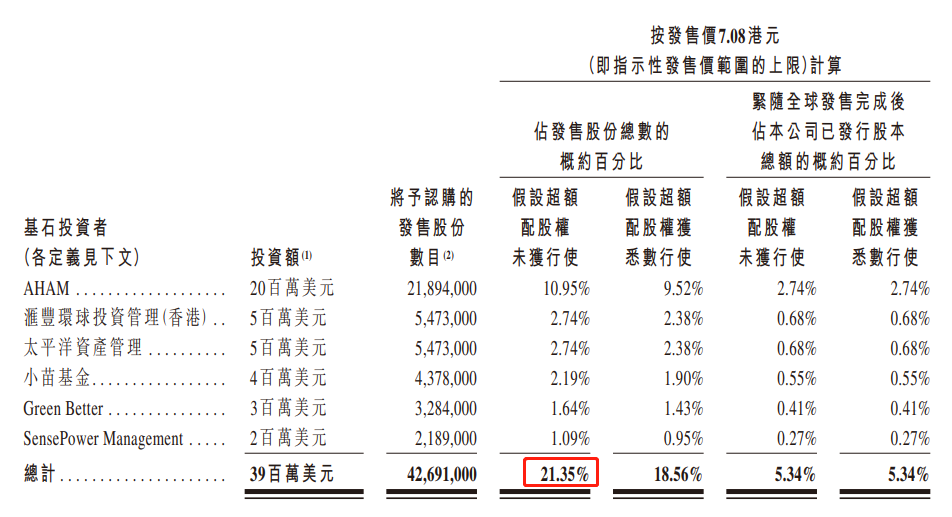 一共吸引了6位基石投资者,一共买走约20%的货
